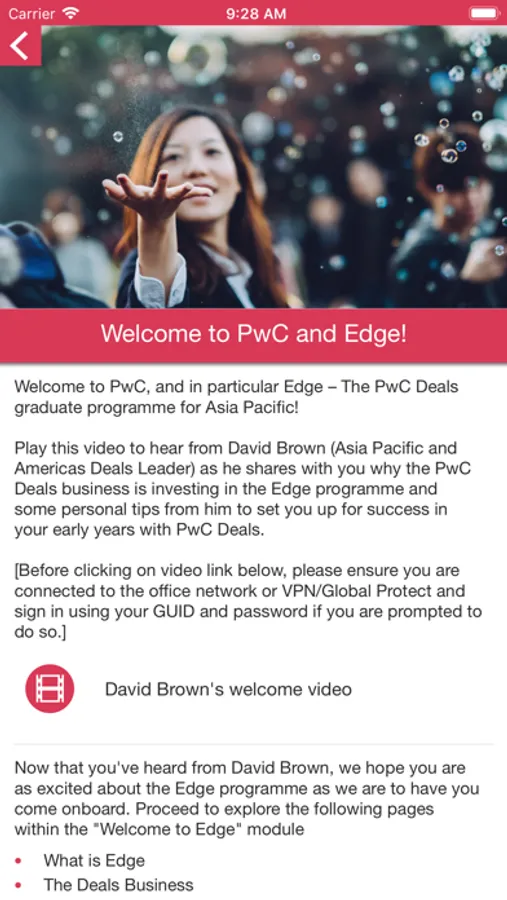 The PwC Edge app is your gateway to all things Edge. The app keeps you informed and connected about your Edge journey, Edge community, Edge news and so much more. Stay on top on what's coming up and the to-do's as you progress along your Edge journey through the app.