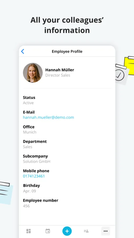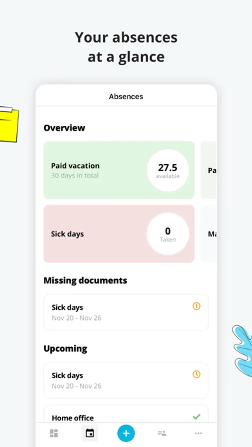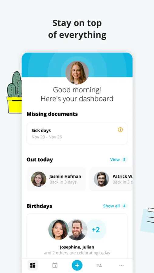 Stay on top of everything without any hassle. See upcoming birthdays, let the app remind you about missing medical certifications and see who's out-of-office.
