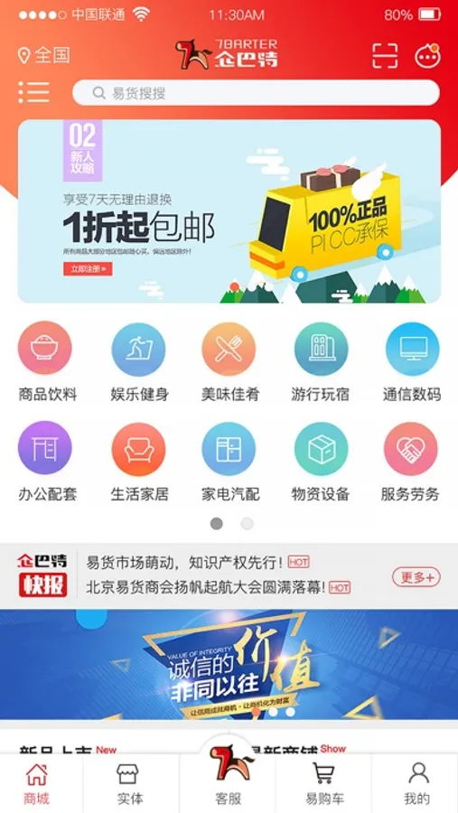 企巴特易货平台的商品类别,覆盖食品饮料、美味佳肴、健身娱乐、游玩行宿、通信数码、办公配套、生活家居、日用电器、生产物资、服务劳务、定制收藏、广告资源等数十品类,平台展示的易货商品数量超百万。