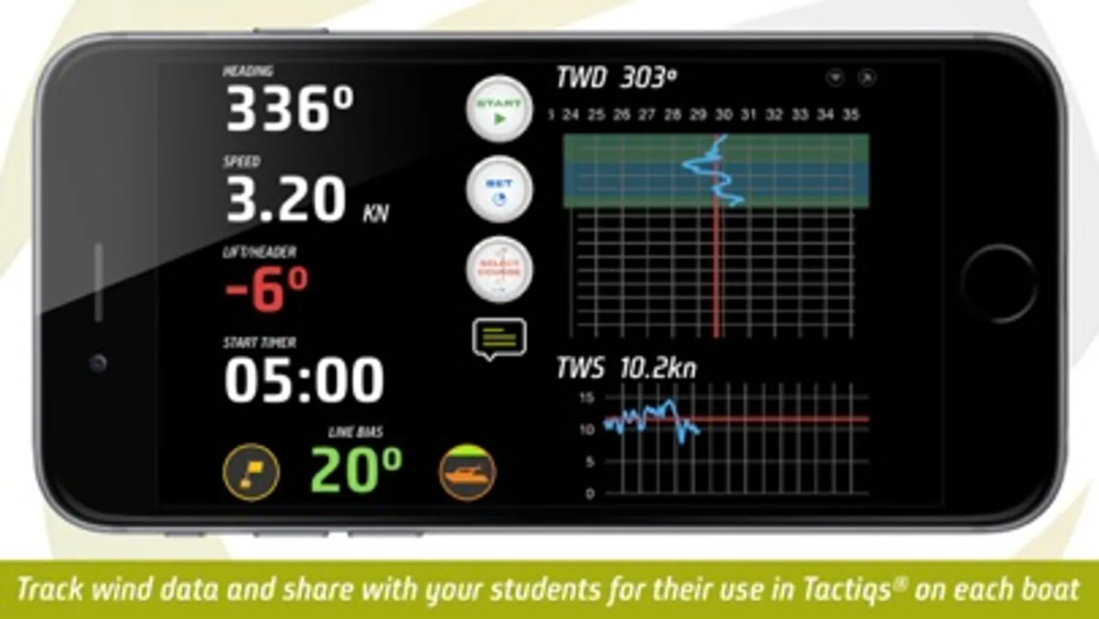 Once you set up the wind station on your coaching boat, connect your iOS device to the station's Wifi access point, and start the SailHub app. Now your students can use our Tactiqs® app on their dinghies without any instruments and still have complete performance data including wind information.