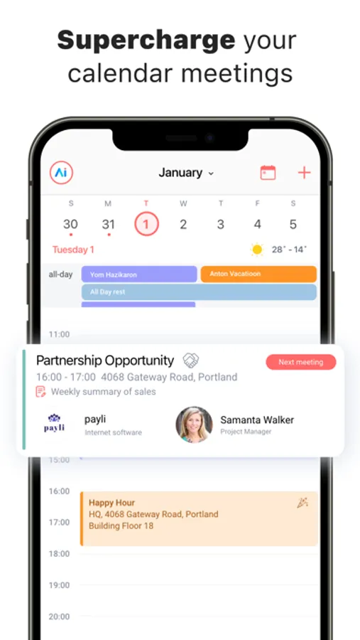 - Calendar.AI adds job titles, photos, and company logos to your agenda.