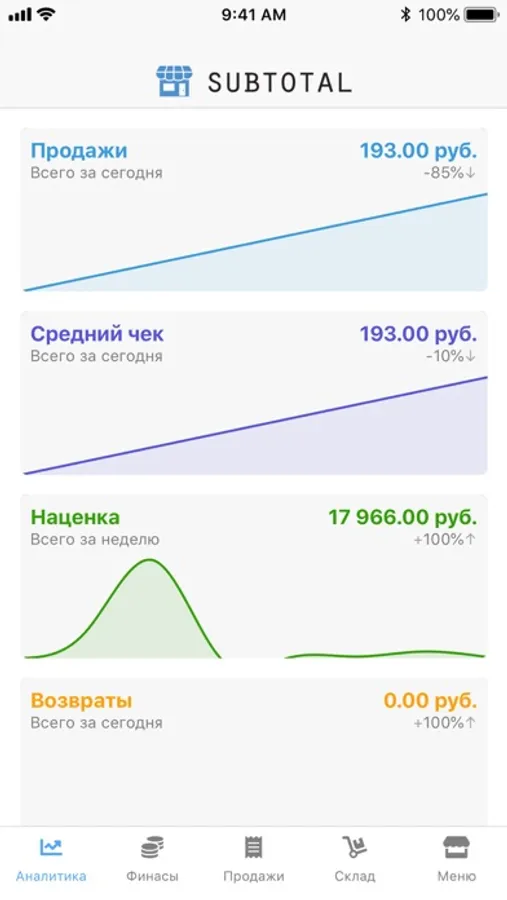Мобильное приложение SUBTOTAL дает возможность владельцу или управляющему быстро оценивать ключевые показатели работы бизнеса из любой точки мира. Аналитические отчеты о продажах и других ключевых бизнес-показателях доступны в мобильном телефоне.