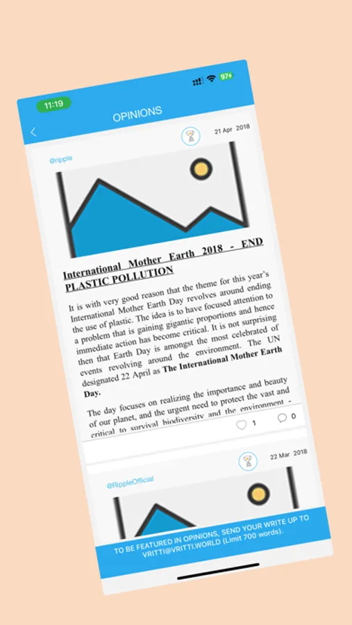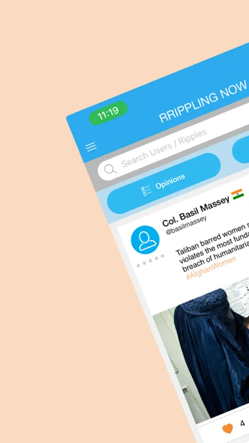 Ripple is a Microblogging app with two editorial contents (Vital Topics and India Connect). It is meant to allow users to post content as text, photo and video. Users would be able to “like”, "comment" and “share” posts of other users .A user would be able to select accounts which he/she would follow and would be able to view his/her own followers. User can search users through search bar available on home screen and follow them.