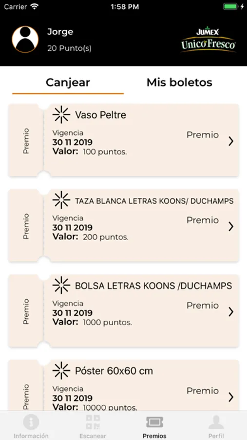 Ganar es muy fácil solo debes descargarla, escanear los códigos únicos impresos en los envases de Jumex Único fresco® de los sabores Arándano, Naranja con pulpa y Naranja sin pulpa envasados en Tetra Pak ®, contestar unas preguntas sobre la exposición y los artistas y ganas increíbles premios.