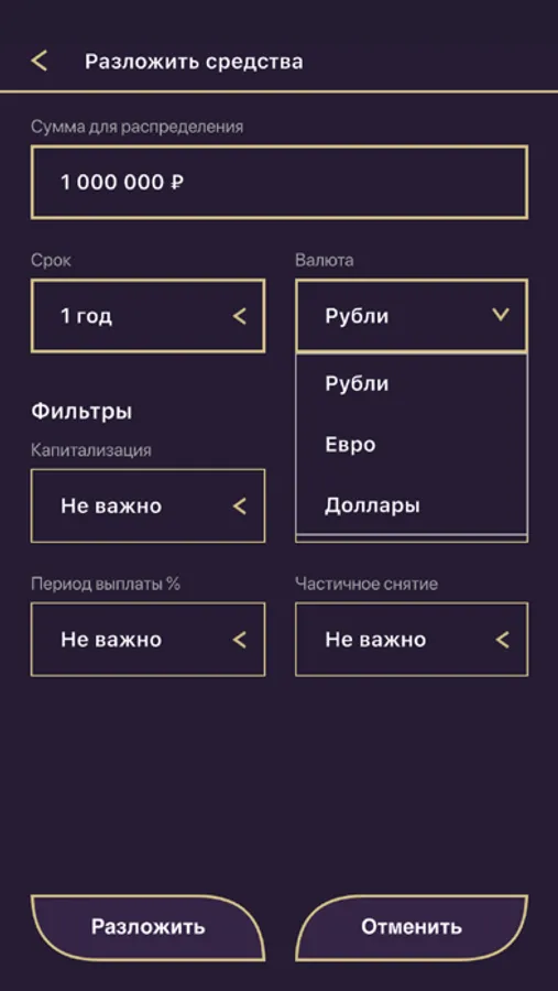 Только сумму для распределения, а также выставить необходимые фильтры. Например, планируемый срок вложения, возможность частичного снятия или пополнения, капитализация процентов и прочее. Вам не надо самостоятельно разбивать сумму на части — каждый вклад содержит рекомендованную сумму к вложению с учётом лимитов (по умолчанию не более 1,4 млн для одного банка, что соответствует сумме, сохранность которой гарантирована агентством страхования вкладов).