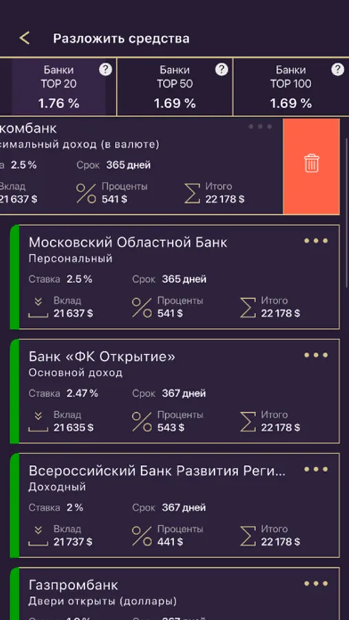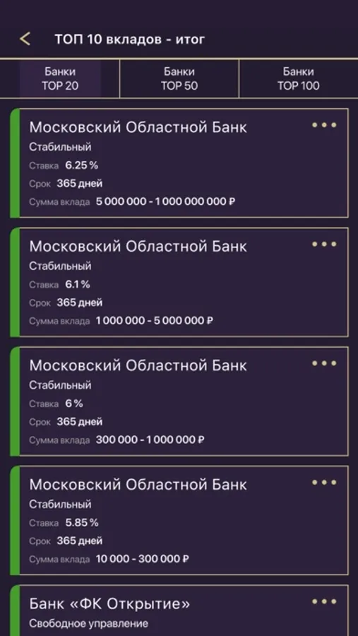 В данной версии приложения мы не учитываем депозиты с переменной процентной ставкой, а также депозиты, открытие которых требует выполнения дополнительных условий, например, приобретение инвестиционных паёв, наличие договора страхования или принадлежности к определённой социальной группе.