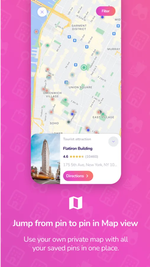 Tap on 'Map View' and see a personalised Map of all the pins you've got saved in your Pinboard. When you arrive at your destination it makes planning where to go and what to do so much easier.