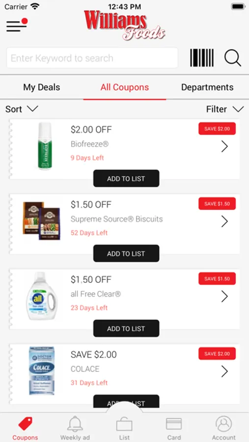 Claim as many coupons as you want with one simple scan! No more searching through mailers or printing out emails, Williams Foods is bringing rewards right to your mobile device!