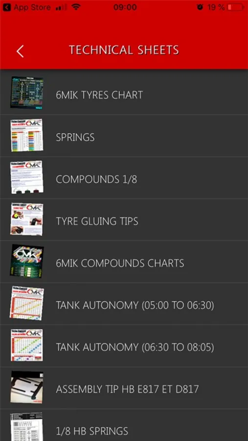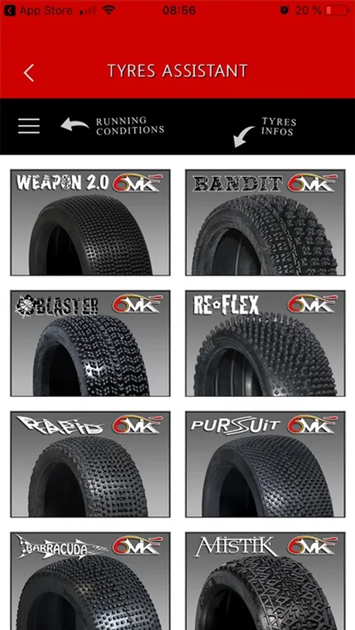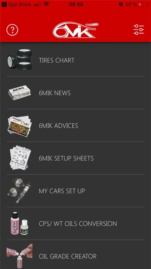 - TIRES CHOICE TOOL : get useful informations about all 6MIK tires range. Select the temperature, the race duration, and track surface, then, the application would select for you the most adapted tire/compound choice.