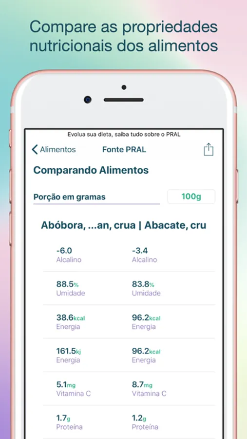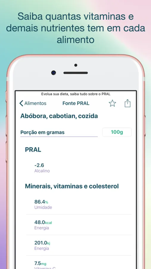 Este é o primeiro app que informa os valores de PRAL dos alimentos e mais todas as referências nutricionais descritas da Tabela TACO.
