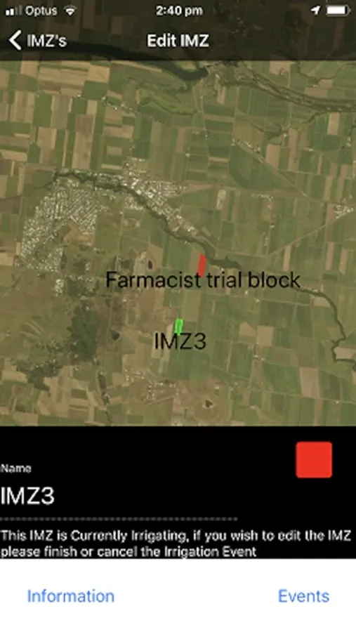 The irrigation app is a simple to use recording tool for the application of irrigation water onto agricultural land. The app is designed to allow the user the ability to create Irrigation Management Zones (IMZ) within their farming operation. An IMZ could be simply described as a parcel of land where irrigation is applied to a known location that may include part of a field, a whole field or a group of fields. The app allows the user to use a simple map interface to trace around the parcel of land that form the basis of an IMZ and give that parcel a unique name. Users can then assign pumps to the IMZ's and record irrigation events against them, through which a report can later be generated including calculations based on water use, cost, area and crop.