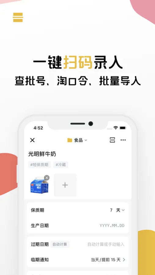 扫一扫商品条码即可快速录入物品基本信息,填入生产日期即可完成录入。系统会自动完成过期日期计算和物品分类。