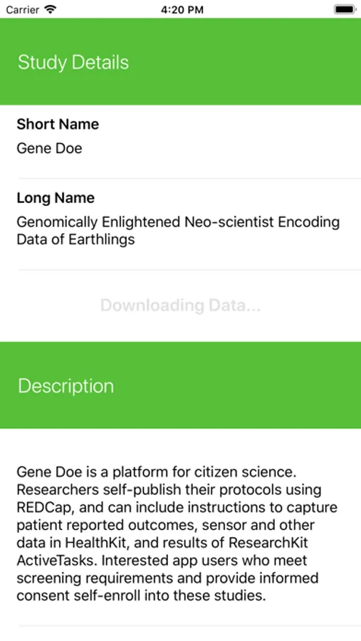 Gene Doe is a platform for citizen science. Researchers self-publish their protocols using REDCap, and can include instructions to capture patient reported outcomes, sensor and other data in HealthKit, and results of ResearchKit ActiveTasks. Interested app users who meet screening requirements and provide informed consent self-enroll into these studies.