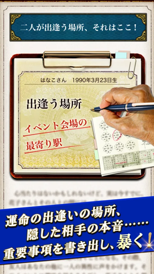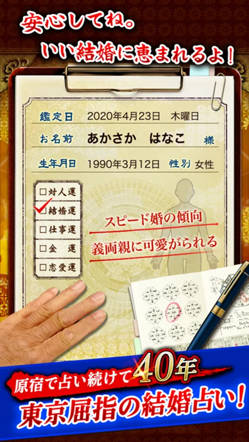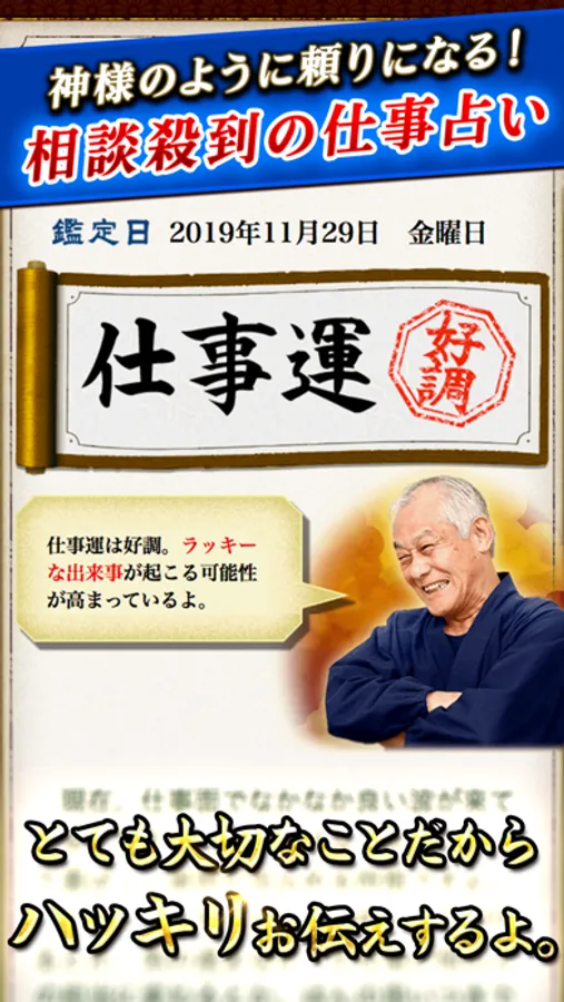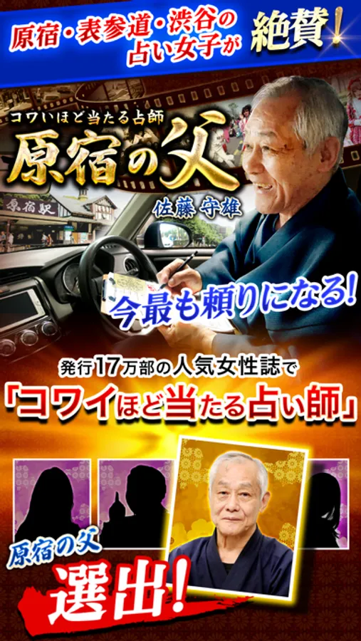 本アプリでは、原宿の父・佐藤守雄の鑑定を受けることができます。