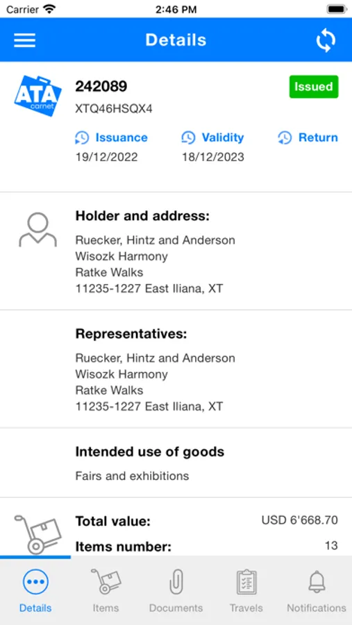 With ATA Carnet, you can speed up declaration processes at customs without the hassle of paper documentation.* The Carnets tab shows you all ATA Carnets stored in your wallet and allows you to manage them and check their status. When at customs, open the required transaction type from the Transactions tab and show the customs officer the QR code. Once the customs officer commits the transaction, you shall receive confirmation of the successful declaration.