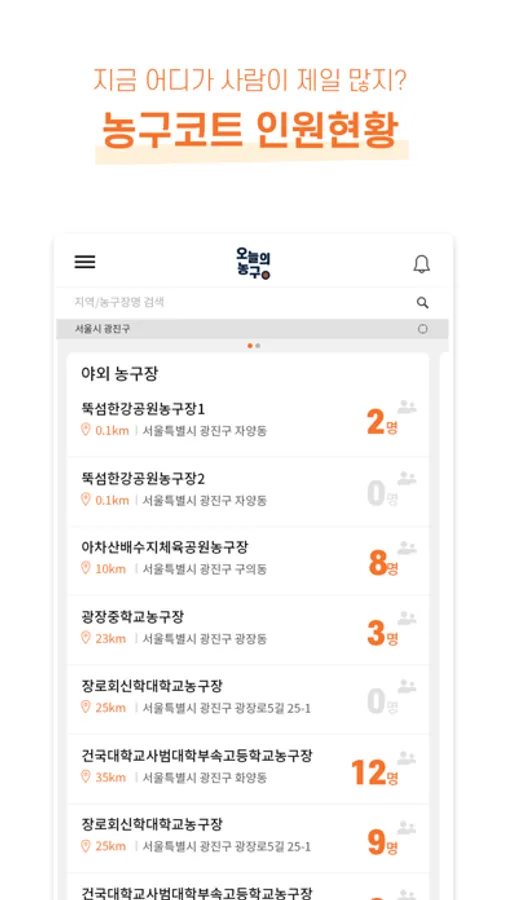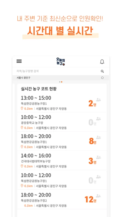 오늘의 농구는 내 주변 농구코트들의 오늘 방문자와 현재 방문자를 보여줍니다.