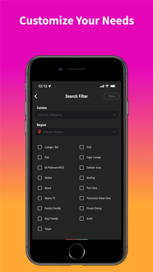 - Find venues by type and features using one or more of the listed filters; lounges, nightclubs, rooftop, live music, sports TV, shisha, and Much More.