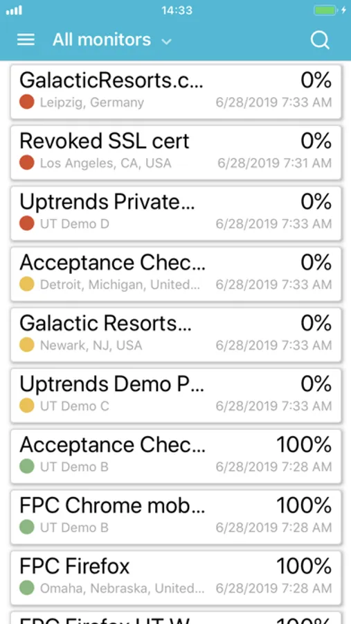 Keep a close eye on your website and server status with Uptrends. The mobile app shows the latest status of your monitoring setup and alerting status. Receive alerts through push notifications.