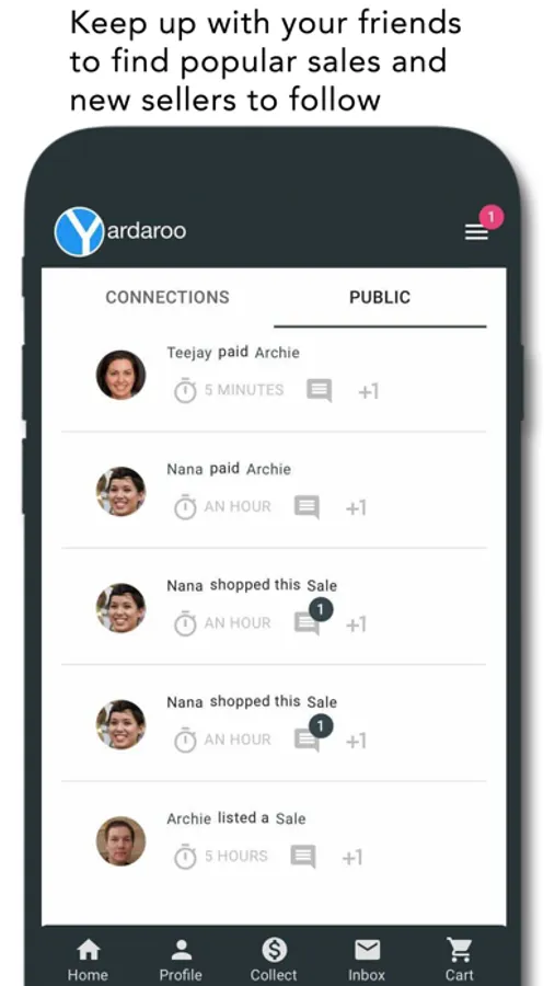 Yardaroo is all about community building. Buyers and sellers can stay in touch with each other by connecting with each other through the app. People can follow each other and engage with each other’s activity to see which sales are popular, organize outings and share pictures of sales. Our internal messaging system offers a convenient way to communicate and ask questions about sales.