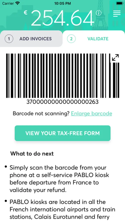 Scan your tax-free form’s barcode from your phone to validate your refund. Follow the instructions in the app and allow at least 2 hours before your departure to avoid rushing. Note that in the case of Northern Ireland (UK), you will still need to print a paper VAT refund form in order to get a manual stamp.