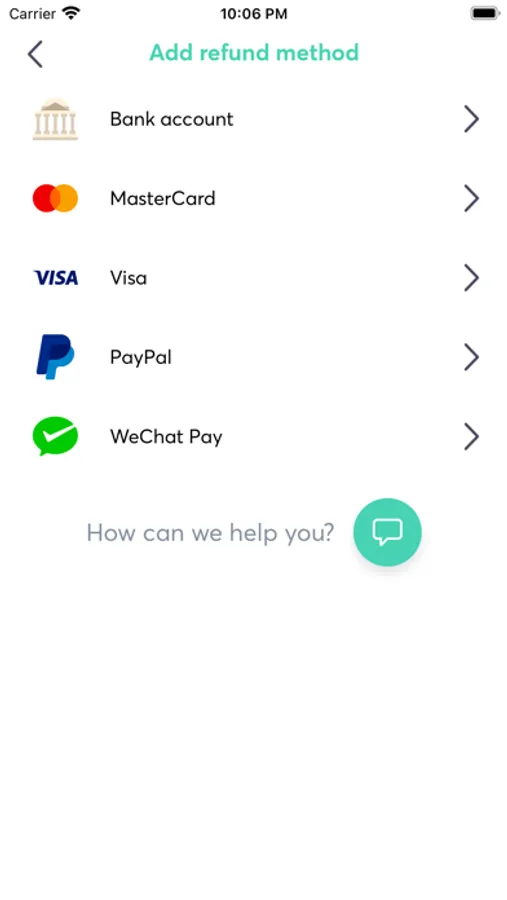 Select your preferred payment method and track the status of your refund claim in the app. Our payment methods include Visa, MasterCard, PayPal, WeChat Pay, and bank transfer.