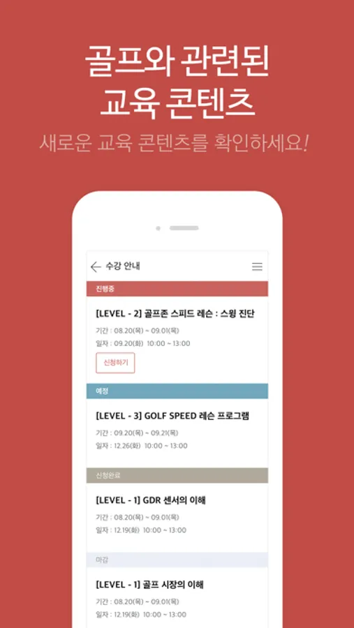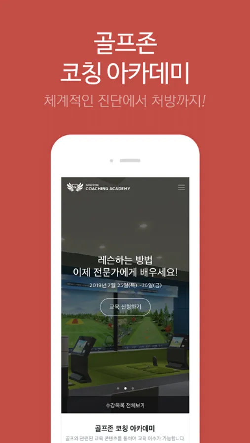 과학적이고 체계적인 골프존 코칭 아카데미 교육 스케줄 확인 및 신청이 가능합니다.
