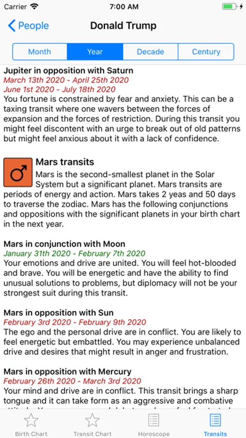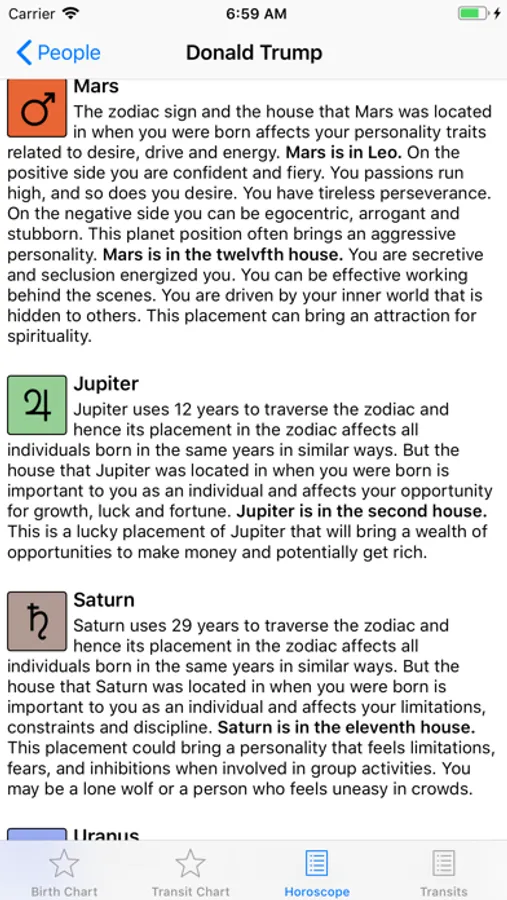 This App creates astrology birth and transit charts with planet and house positions that have an accuracy comparable to Astro Dienst (astro.com). It is preloaded with the birth data for 100 famouse people like Joe Biden, Kamala Harris and Donald Trump. You can easily add yourself and friends and family. It has a built in expert system that provides horoscope and transits intepretations. The transit chart is smootly animated and you can choose displaying the tranists for the next month, year, decade or century. The transit chart allows you to freeze and step though the transist. The charts can be zoomed and panned to view any detail. When the Application runs on an iPad the split screen display allows you to conveniently change the birth information and instantly see the changes to the charts and horoscopes. The application contains the geolocation for majority of the cities in the world but also allows you to override the birth location on the built in map if you want to.
