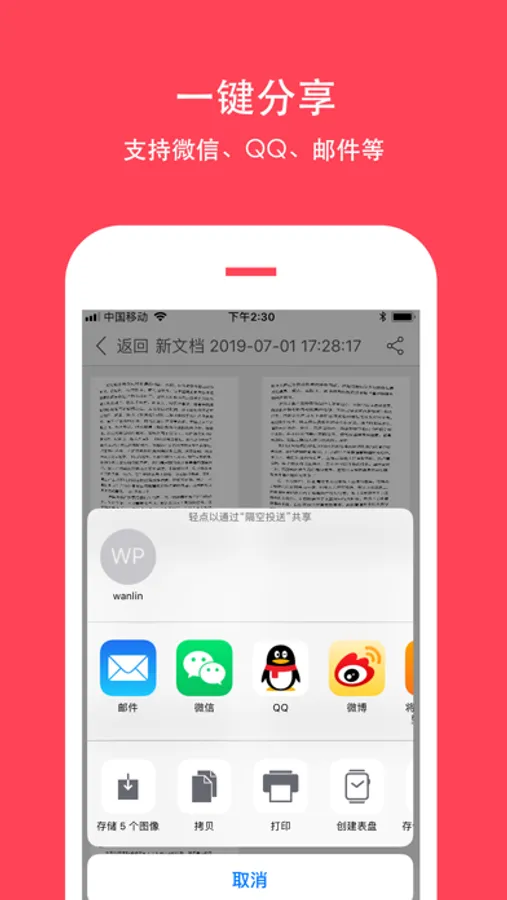 •可以邮件发送、连接打印机、微信及QQ分享等。
