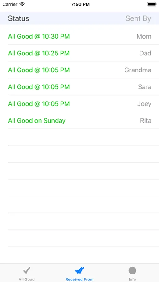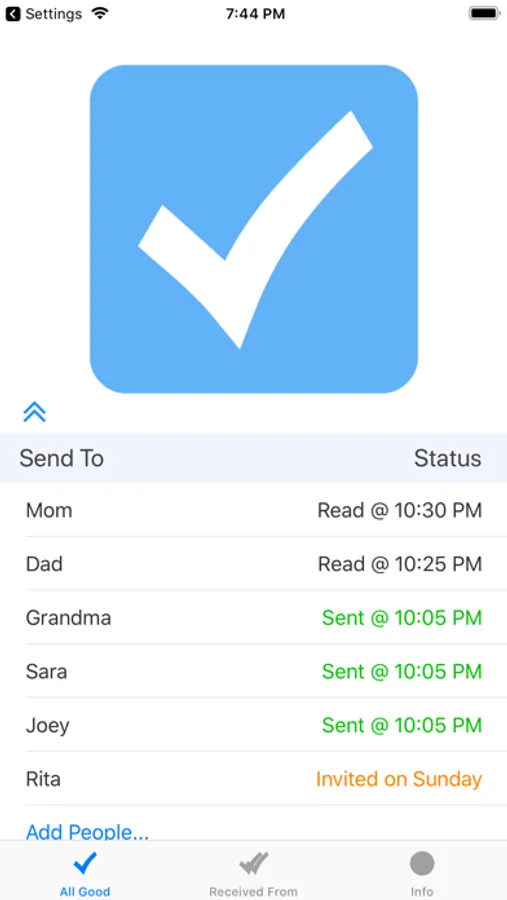 Simpler than a text or call or email because the recipient doesn’t need to respond. Set up in advance who you want your contact person (or people) to be, and when they accept your connection, they’ll know to expect regular All Good updates from you. If you miss a day, then they’ll know to investigate.