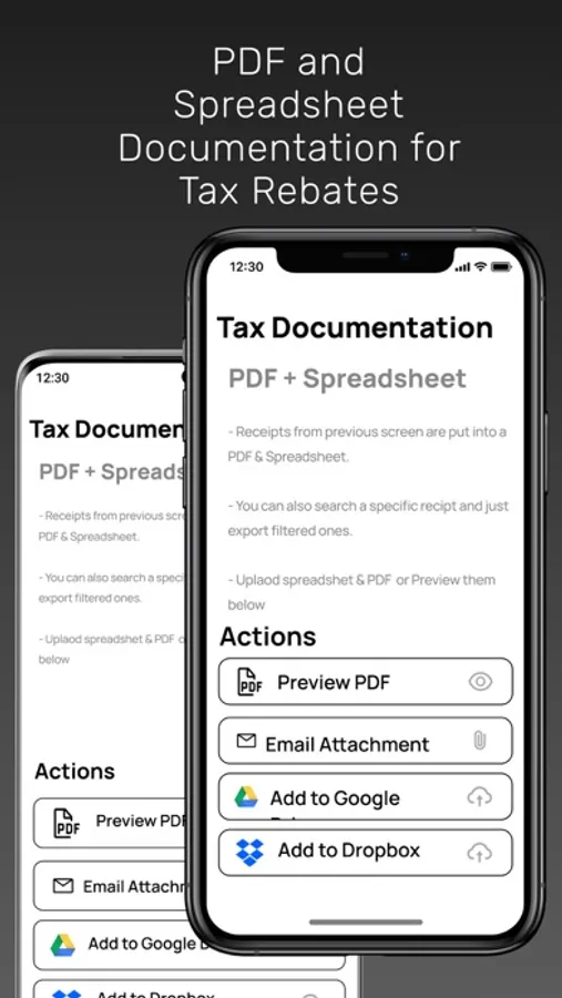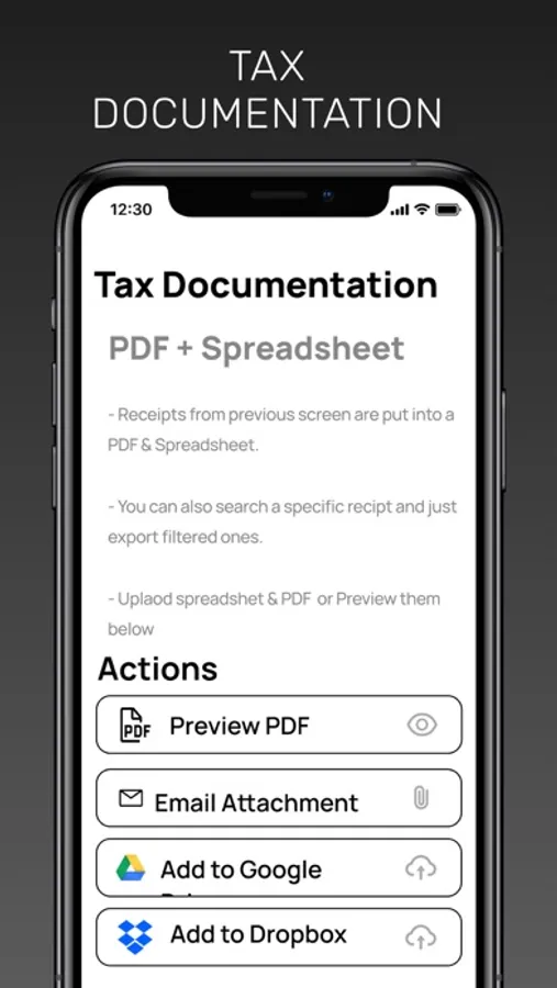 5) Export all receipt entries into a Tax Write Off PDF, or a Spreadsheet, when you want to organize or calculate your monthly/yearly finances. Upload that spreadsheet to Google Drive, Dropbox, or Email it directly.