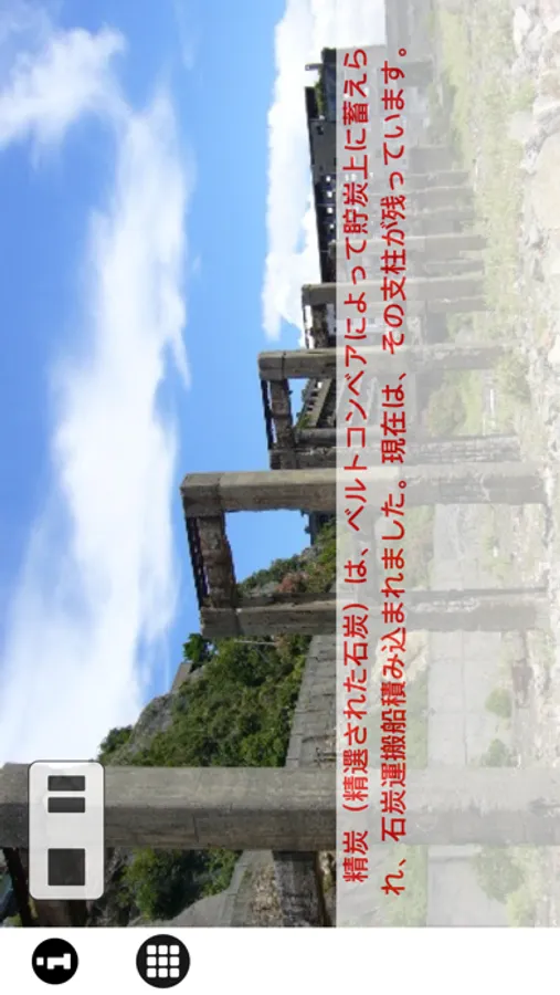 OmegaCode printed on the bottom-right corner.When smatphone camera take an image of OmegaCode, immediately recognize its image and sound “Bon”. Then image of Gunkanjima comes appear on display and announce “Please tap the picture you want to see”. There are four guide places at Gunkanjima, so scroll down image and tap the place you want to see. Multi-language Cruse guide softwate will activate and sightseeing sound guide come out in synchronism with pictures and closed caption.