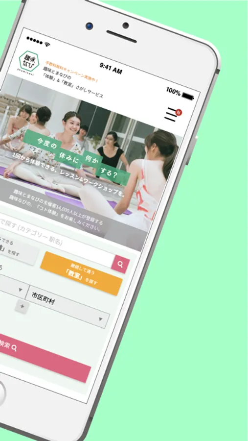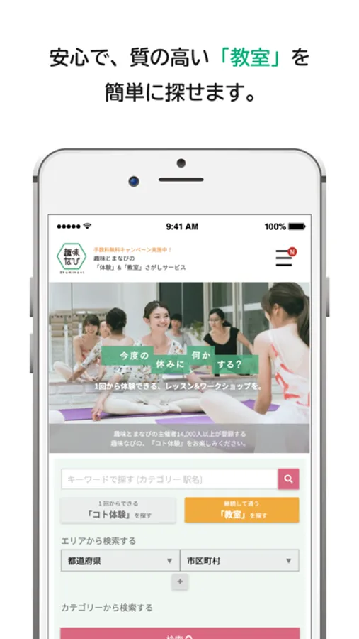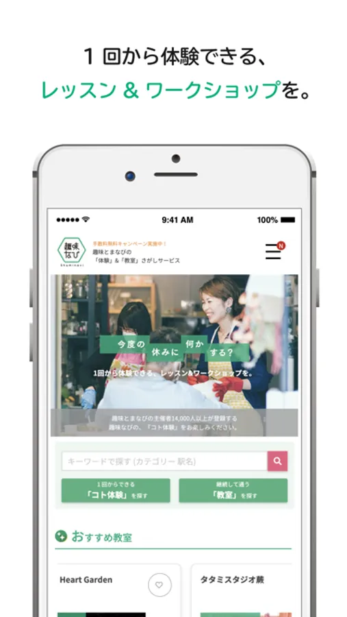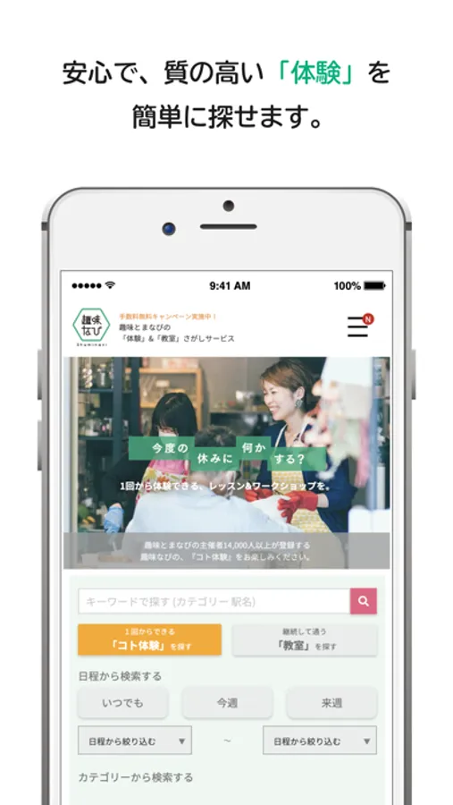 教室やコト体験の情報が約15,000件掲載中。エリア、ジャンルを絞って検索が可能です。
