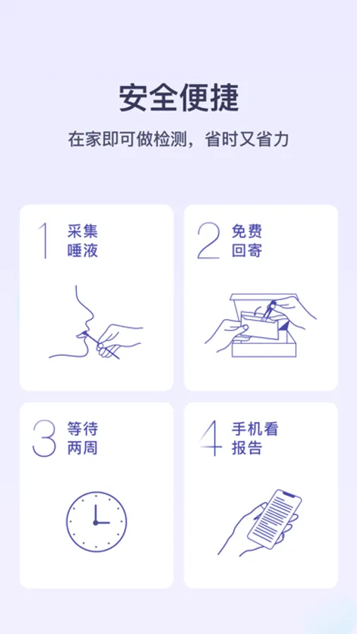 收到安我小蓝盒后,取出采样器,只需用安全无创的医用海绵头在口腔内壁轻轻刮拭左右各10次,即可完成取样,一键预约免费回寄。