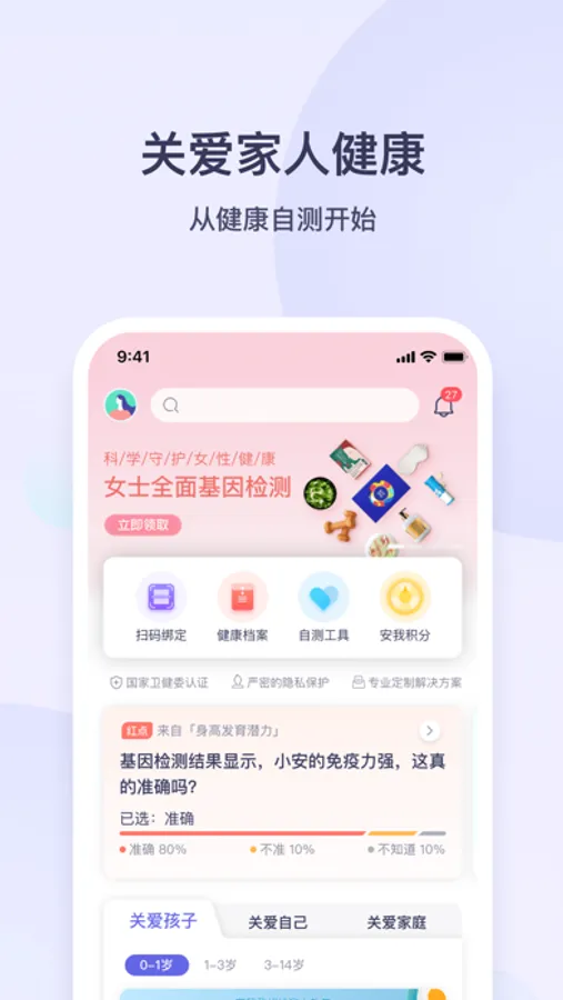 安我生活,是安我基因品牌的生活方式服务APP。您不仅能在APP内得到一份有趣、通俗易懂且生活化的基因检测报告,还可以获得基于自身基因信息的科学专业的定制化健康解决方案,其中包括:小工具(身高、美肤、营养)、专业内容推荐、商品推荐、专家咨询、医生等。更有丰富产品如儿童免疫力,疾病风险,过敏检测,营养吸收能力,身高发育,以及女性健康生活相关的护肤,塑身,运动,疾病风险等,供您随心选择!