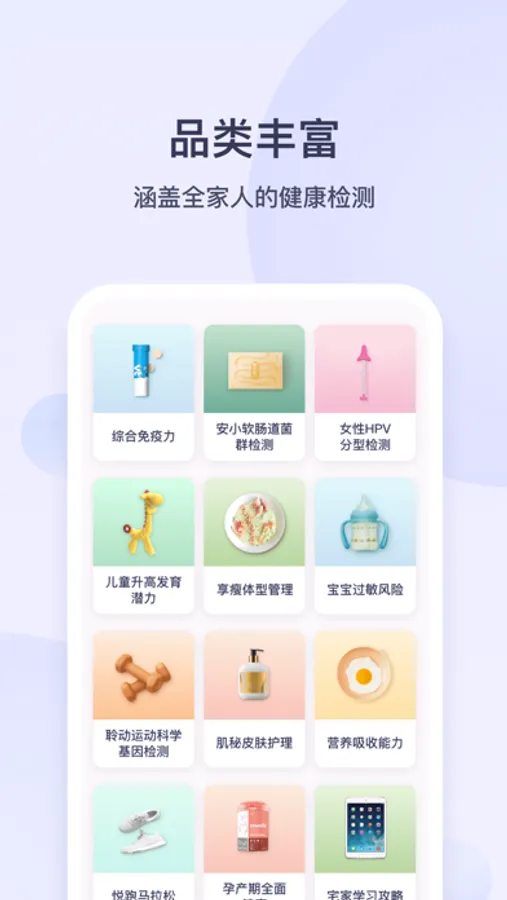 包括儿童健康成长相关的:儿童免疫力,疾病风险,过敏检测,营养吸收能力,身高发育,早教等产品;