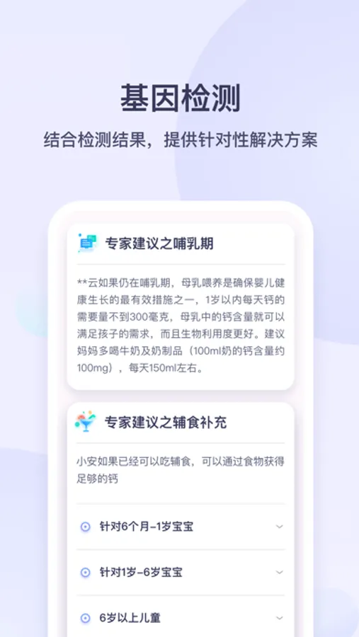 检测后您还可以获得基于自身基因信息的科学专业的定制化健康解决方案,其中包括:小工具(身高、美肤、营养)、专业内容推荐、商品推荐、专家咨询、医生服务等。