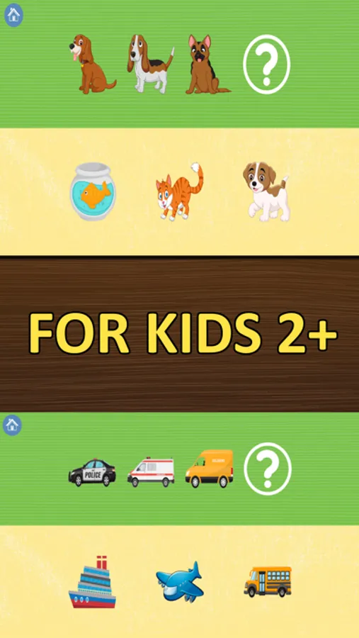 The application contains 3 levels (120+ variants tasks) with various colorful combinations of items. The child gets acquainted with different concepts and objects and learns to distinguish them.