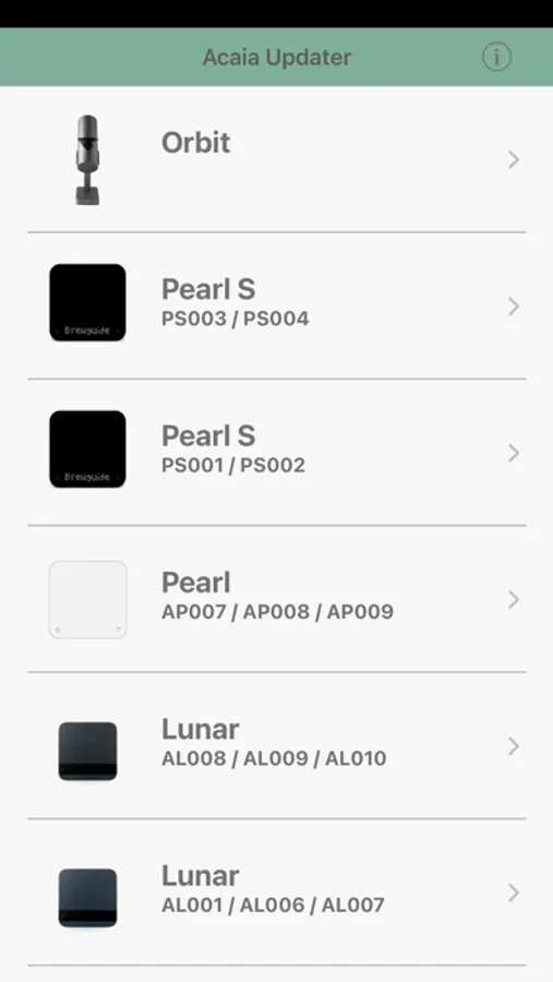 The Acaia Updater app will display and download all current firmware and information for the above models mentioned including firmware number and release notes. The Acaia Updater will replace the Pearl Model S Updater, Lunar Updater, Orion Updater, and Cinco Updater apps.