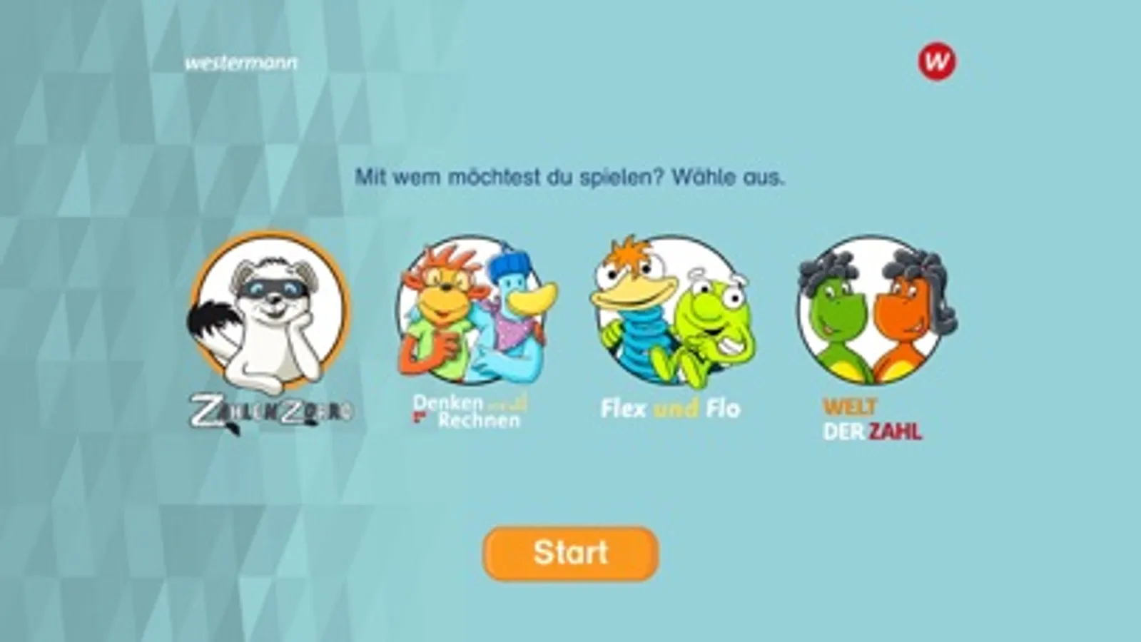 Bevor das Training startet, wählen die Kinder aus, ob sie mit Zahlenzorro, mit Nick und Emma aus dem Lehrwerk Denken und Rechnen, mit Flex und Flo oder mit Zahlix und Zahline aus der Welt der Zahl spielen möchten.