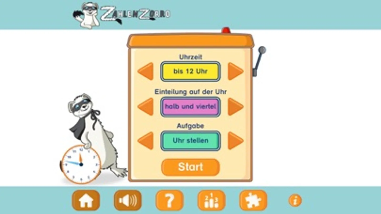 Dann geht es los! Die Kinder können den Zeitraum „bis 12 Uhr“ oder „bis 24 Uhr“ üben und sie bestimmen die Einteilung auf der Uhr, die sie trainieren möchten (volle Stunden, halbe Stunden, Viertelstunden oder Stunden und Minuten).