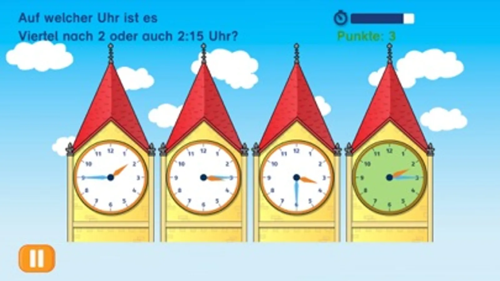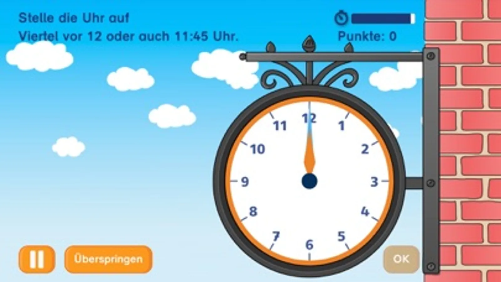 Ziel ist es dann, so viele Uhrzeiten wie möglich in der vorgegebenen Zeit zu bestimmen. Dabei versuchen die Kinder eine möglichst hohe Punktzahl zu erreichen. Für jede neue Bestleistung gibt es ein neues Teil für ein Puzzlebild.