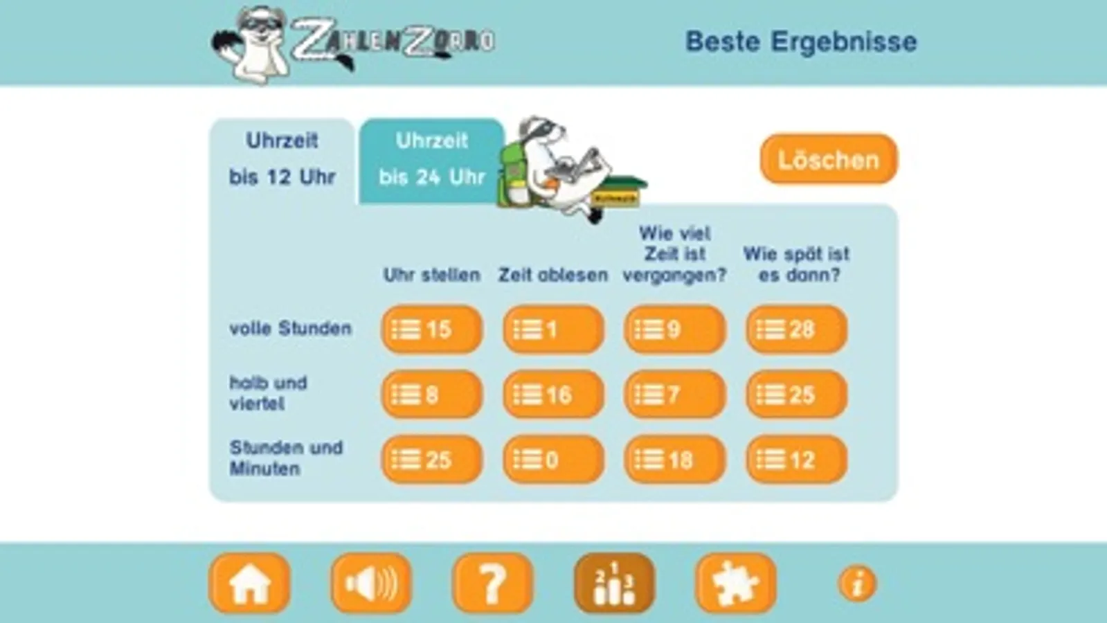 Die Einzel- und Bestleistungen der Kinder sind jederzeit in einer Übersicht aufrufbar. So ist gleich erkennbar, welche Uhrzeiten sie schon trainiert haben und wie viele Punkte erreicht wurden.