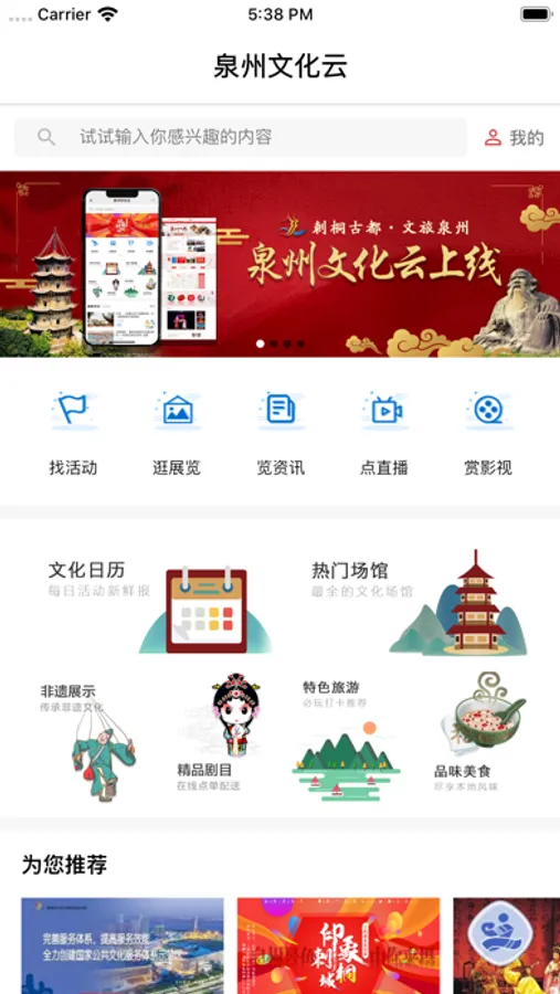 泉州文化云是一款聚焦文化领域,提供公众文化生活服务的交互互联网平台,现汇集泉州全部的文体活动、场馆资源、文体社团。平台中集活动预约、空间展示等功能为一体,为用户提供便捷的文化品质生活服务