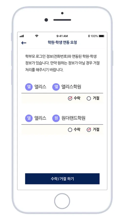 등하원 안심 문자를 받아보시기 위해서는 학생-학부모 연동이 필요합니다. 연동 요청은 학원에서 진행합니다. 휴대폰 전화번호 기반으로 연동 요청 메시지가 전달됩니다. 보틀 사용자앱을 설치하고 연동 요청 수락하면 완료 됩니다.