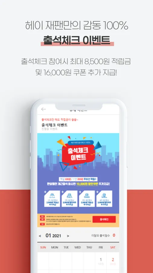 8. 출석체크 참여시, 최대 8,500원의 적립금 및 1만6천원 쿠폰 추가 지급