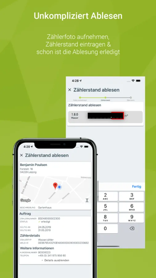 • Ablesung von Wasser-, Strom-, Gas- und Wärmemengenzählern