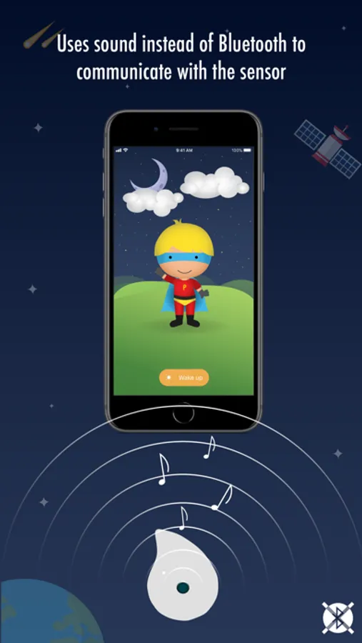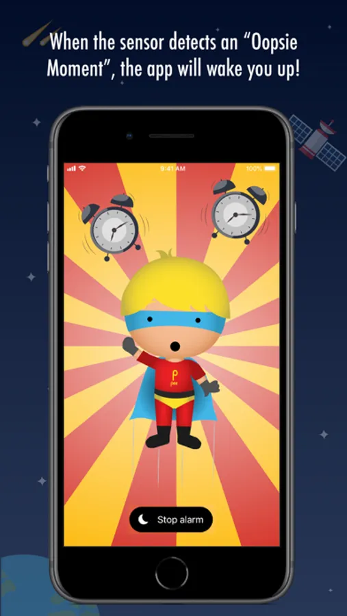 The Oopsie Heroes sensor can be easily attached to any underwear or pajama pants. If the sensor detects a urine leak, it will send a harmless audio signal to the mobile device which will then wake up your child using an alarm sound chosen by you!