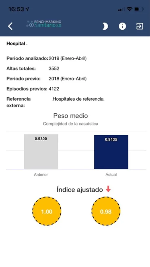 En la app BS3-Hospital se pueden consultar los resultados comparativos de las 8 métricas fundamentales en Gestión Clínica hospitalaria. Los resultados se muestran para el periodo acumulado del año en curso, y para el mismo periodo de meses del año anterior.