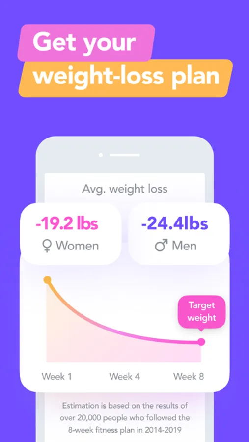 Estimated results: 3.1-12.8% weight loss through a high-intensity fat burn or on average 19.2 lbs among women and 24.4 lbs among men who trained with the Fitingo™ workout plan and managed their calorie intake.