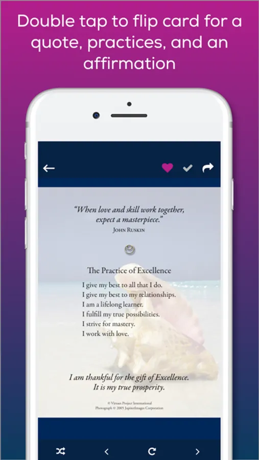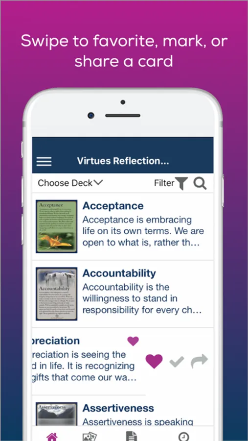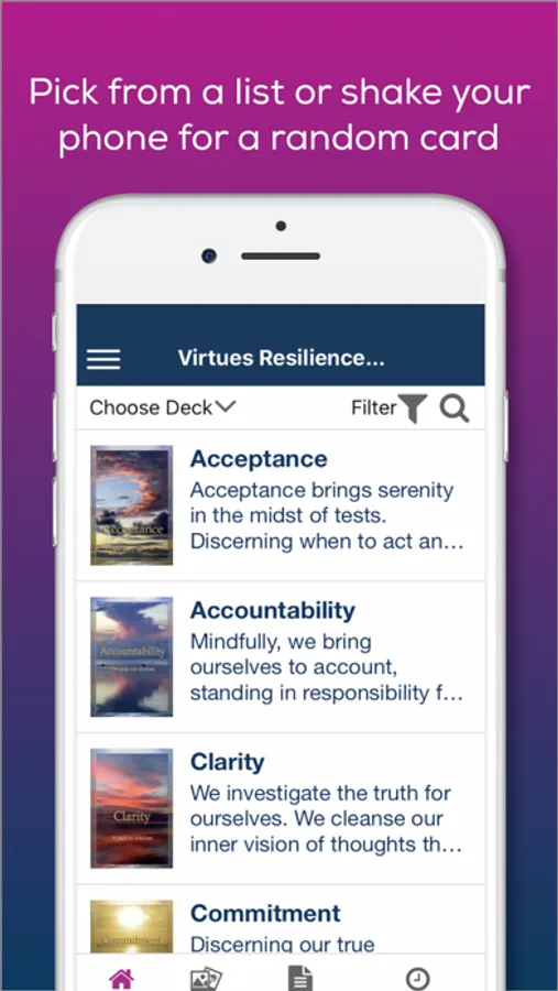 The Virtues Cards app has many applications. It can be used in decision making; to strengthen relationships; enhance values and ethics; create a positive mindset; or simply to provide a positive focus for your day.